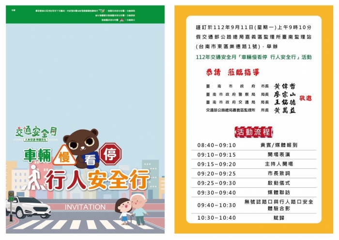響應交通部訂定112年9月為交通安全月,舉辦無號誌路口與行人路口安全體驗活動,加深學童及高齡者對路口安全的認識,讓交通安全觀念深植人心。妥善運用民間資源,透過公私協力方式,結合公、私部門各自優勢,促